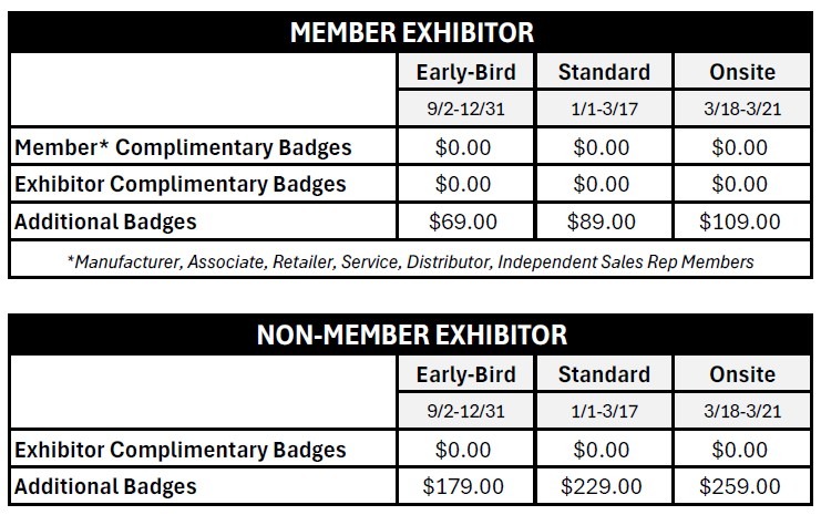 - Exhibitors receive 2 complimentary badges for every 100 sq. ft. of exhibit space purchased.