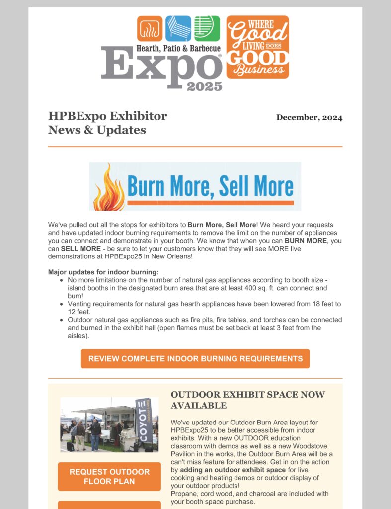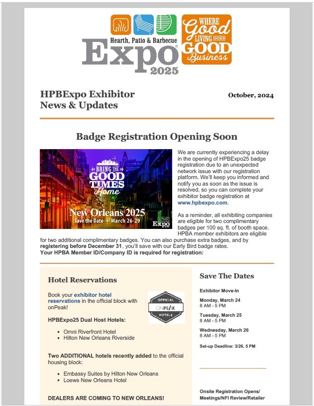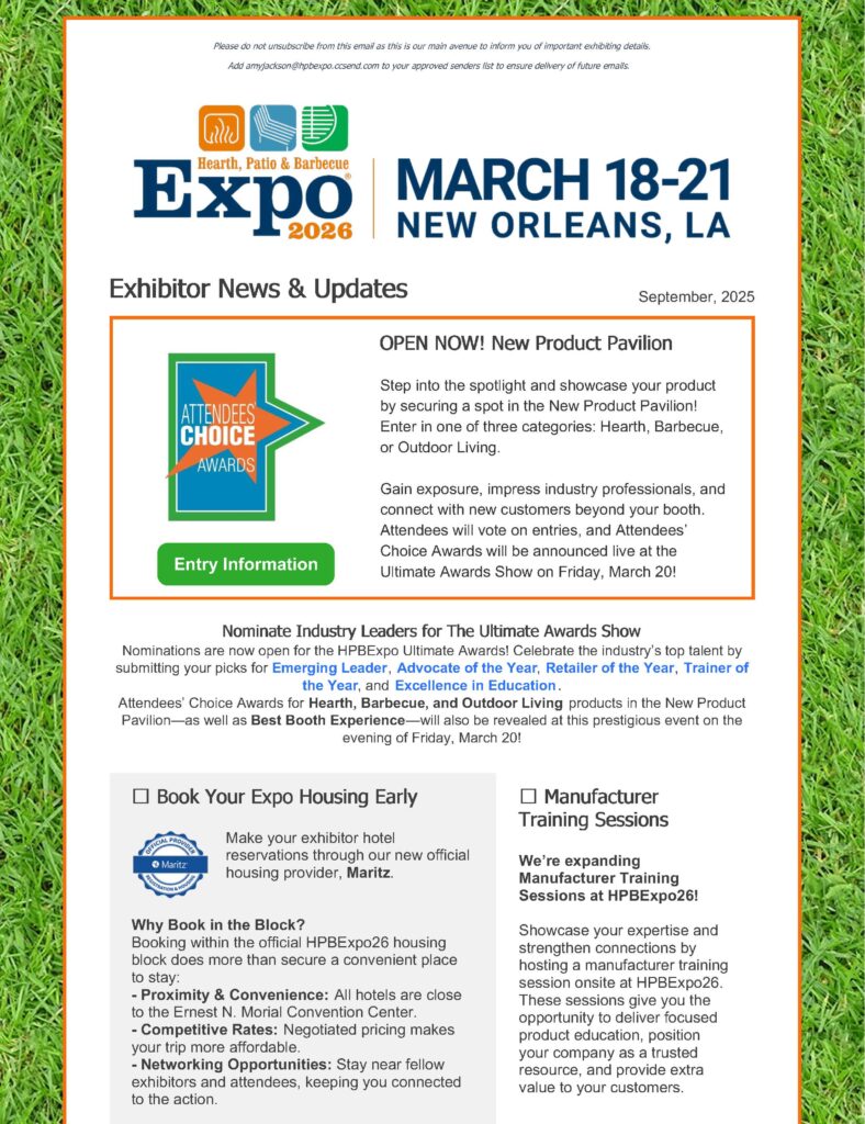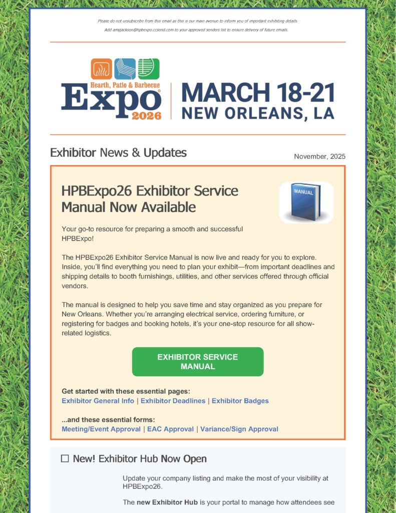 HPBExpo26 Exhibitor Newsletter emails are sent to every exhibiting company’s designated Expo Contact. The Exhibitor Newsletter contains important information, dates and deadlines, rules and regulations, tips, reminders and more! The designated Expo Contact is urged to forward pertinent information to their appropriate team members.
